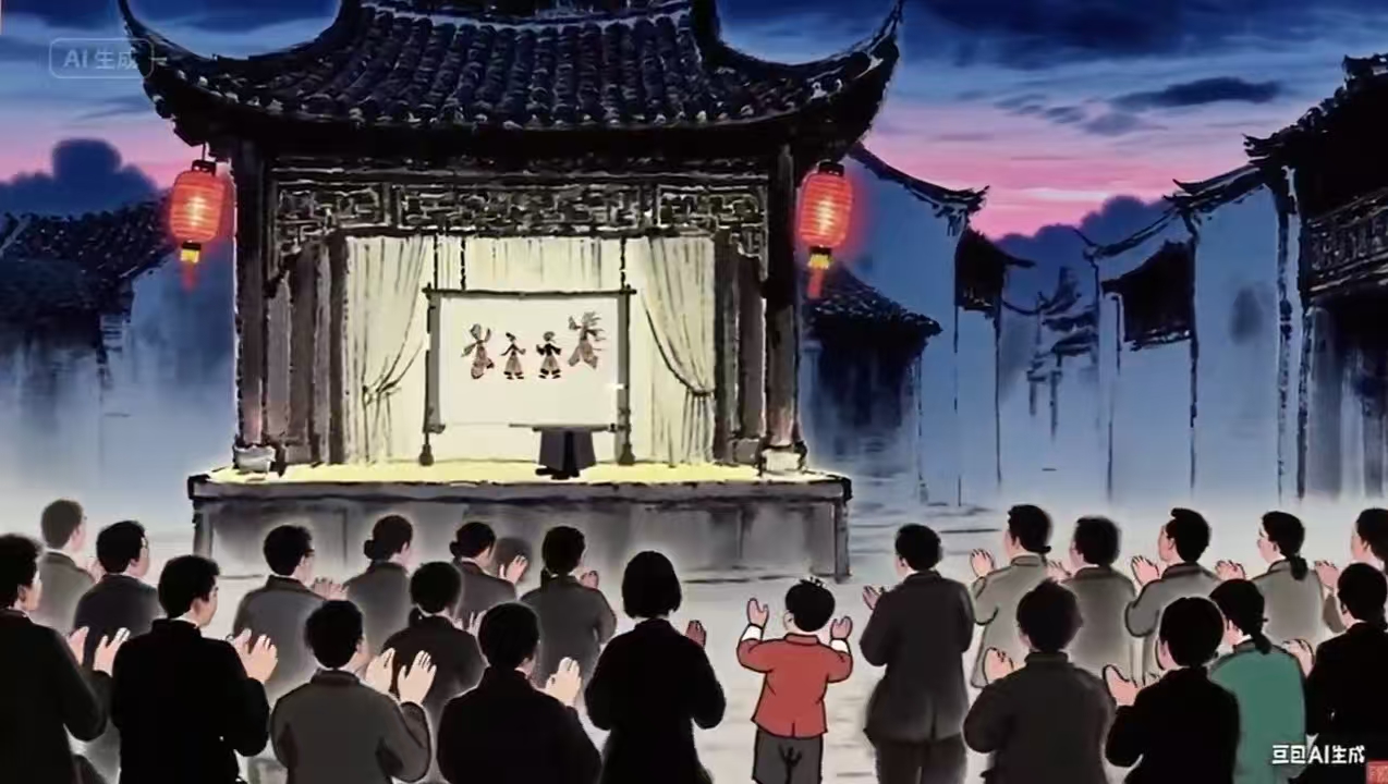 《影脉——皮影戏的千年光影》聚焦非遗艺术皮影戏,探索传统文化与现代科技的融合。组长李辰希表示:“我们希望以皮影戏为切入点,探索AIGC技术如何为传统文化注入新的生机活力。”团队确立了“历史辉煌—传承困境—科技新生”的叙事框架,运用豆包进行文生图,再通过即梦将静态图片转化为动态视频。为了呈现理想的水墨画风格,成员们不断优化提示词,最终让皮影戏在AI的赋能下焕发出独特魅力。